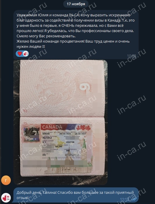Уважаемая Юлия и команда IN-CA, хочу выразить искреннюю благодарность за содействие в получении визы в Канаду. Т.к. это у меня было в первые, я...